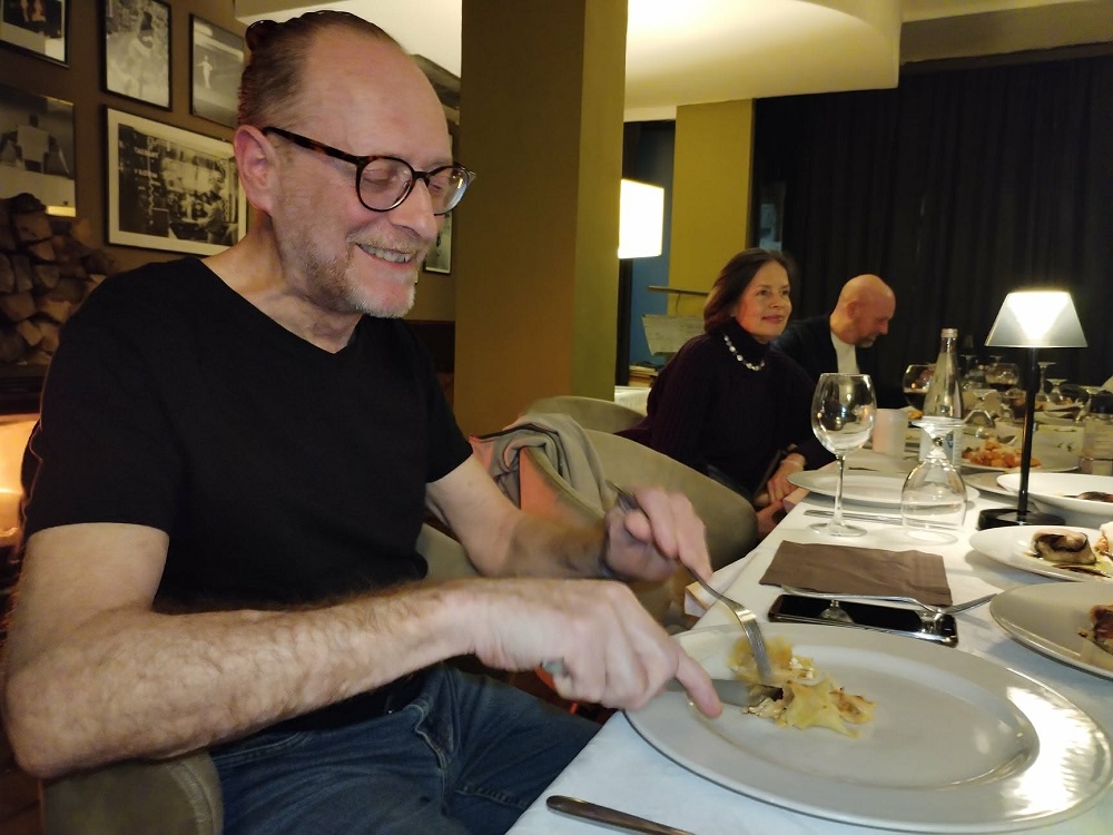 На долга маса, со десетина луѓе, меѓу кои, Фабио, Италијанец кој зборува италијански и француски и неговата партнерка, Германката Ина, која зборува германски и англиски, шеф Влатко и неговата сопруга, Украинката Олга, Мариа Пиа, Сицилијанка мажена за Македонецот Драган, младиот шеф Жика со неговата сопруга-битолчанката Марија и Шкотланѓанецот Марк Диксон. Комуникацијата се одвиваше на мешавина од македонски, италијански, англиски и германски, но беше интересна, динамична и вкусна….molto bene, sehr gut и very good…