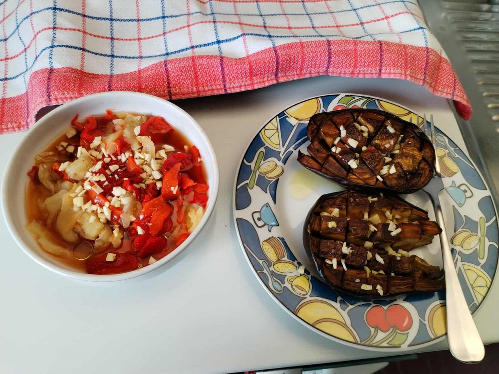 А како прилог, печени пиперки и печени модри домати со многу лук, маслиново масло и оцет, па мали слатки домати со кромид, модри патлиџани и домашно вино….