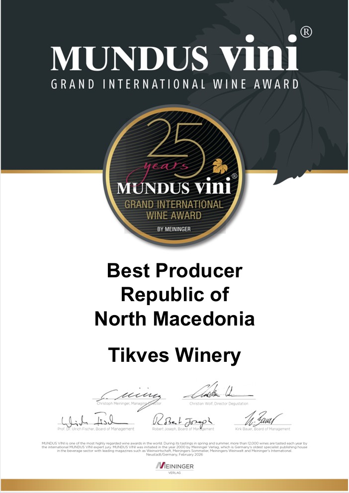 Оваа почесна титула им се доделува на производители на вино кои во текот на 25-годишната историја на Mundus Vini покажале исклучителна конзистентност, врвен квалитет и извонредни резултати, позиционирајќи се меѓу најуспешните и најнаградуваните учесници во историјата на овој реномиран натпревар. Наградата е уште една силна потврда за меѓународната препознатливост на вината на „Тиквеш“, кои со години наназад освојуваат бројни признанија на најпрестижните светски натпреварувања и дегустации. Признанието „Најдобар производител – Република Северна Македонија“ се доделува врз основа на долгогодишните резултати и медали што вината на визбата ги освоиле на Mundus Vini, една од највлијателните вински манифестации во светски рамки.